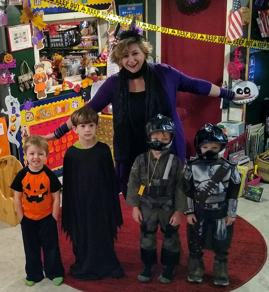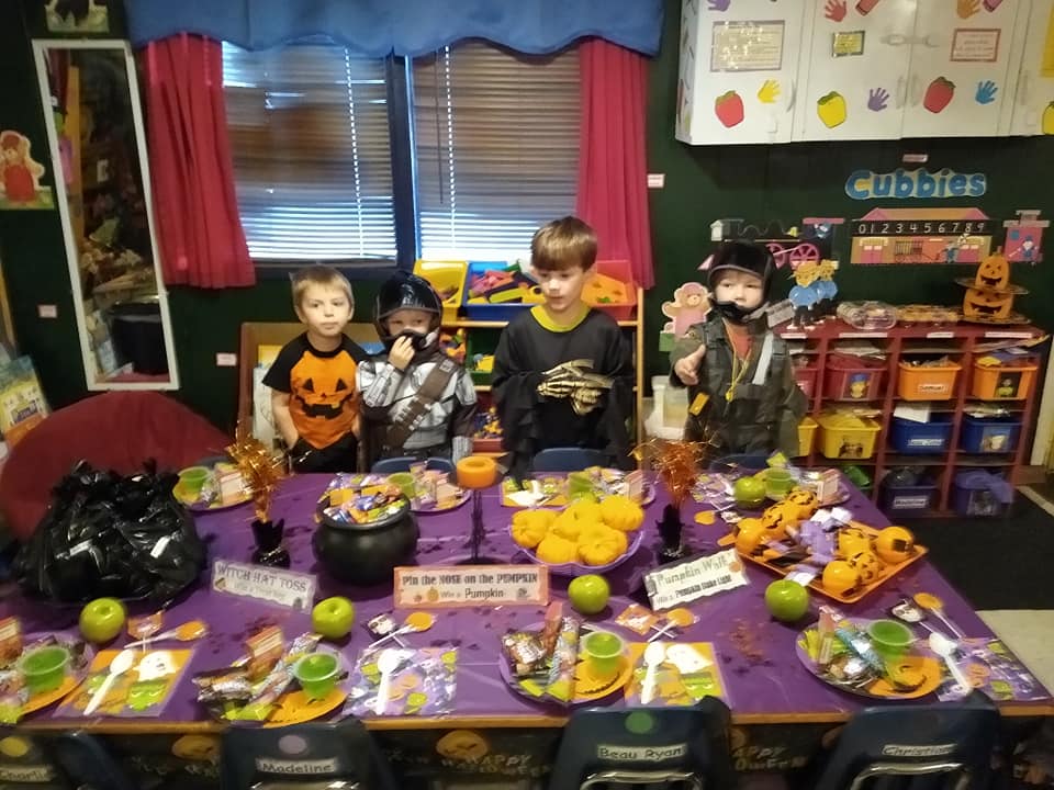 We had another successful HALLOWEEN BASH in the KIDS FIRST Teddy Bear Class! We heard our hilarious Skeleton Hiccups book, and then the wild rumpus began. We danced to the Walking Through the Cemetery Song during our Pumpkin Walk contest, winning a Pumpkin Light Stake, played a Witch Hat Ring Toss Game, earning a Treat Bag, and then spun around in circles for our Pin the Witch Hat on the Big Orange Pumpkin, earning a cute Mini Pumpkin! The Purple People Eater, Witch Doctor and The Monster Mash songs brought us into the Halloween spirit while we feasted on our Halloween appropriate snacks; Finger cheese sticks, red Dracula strawberries, green monster apples, black bat raisins & blackberries, green Frankenstein Jell-O, purple people eater Juice, pumpkin patch cheese balls, chips, cupcakes and Halloween cookies. And then winding down the activities by watching Alvin & the Chipmunks Meet the Wolf Man made it all that.