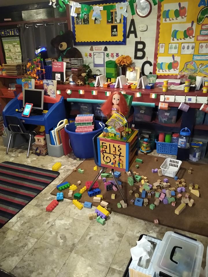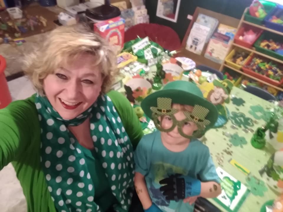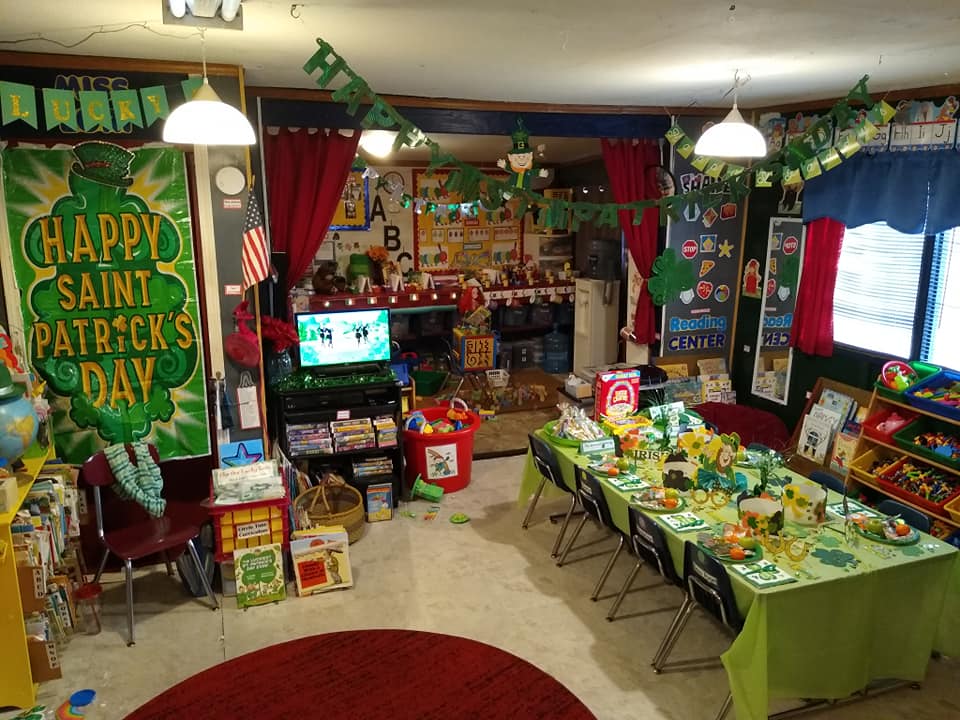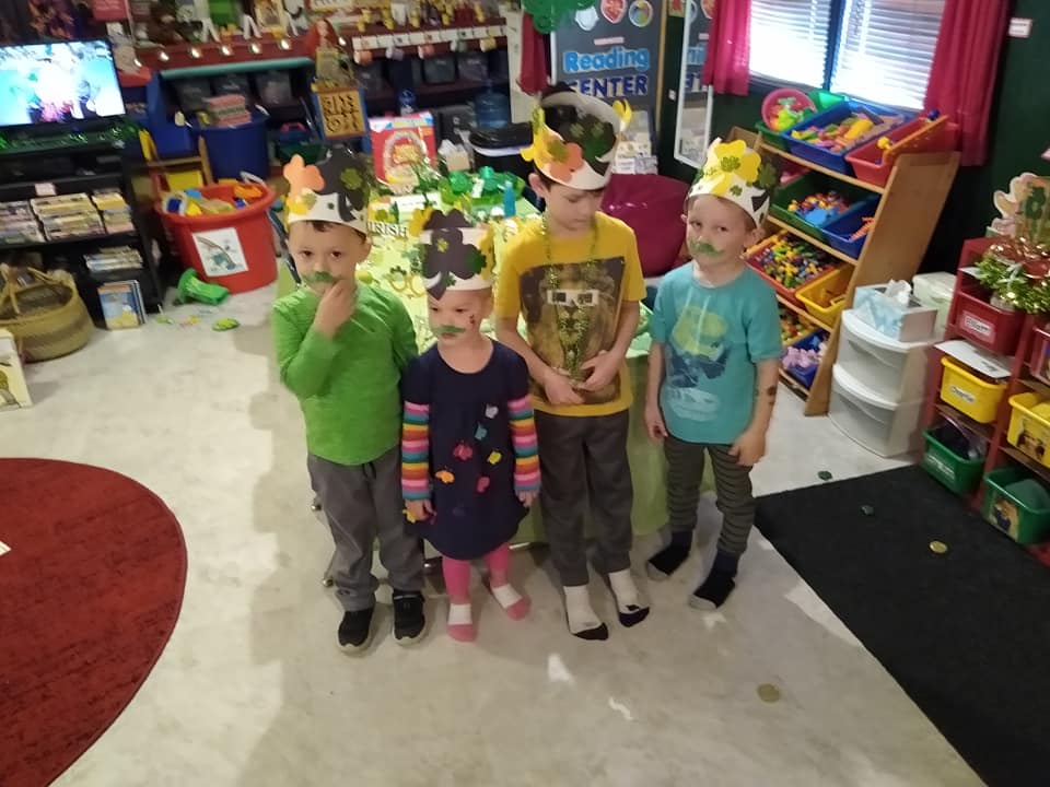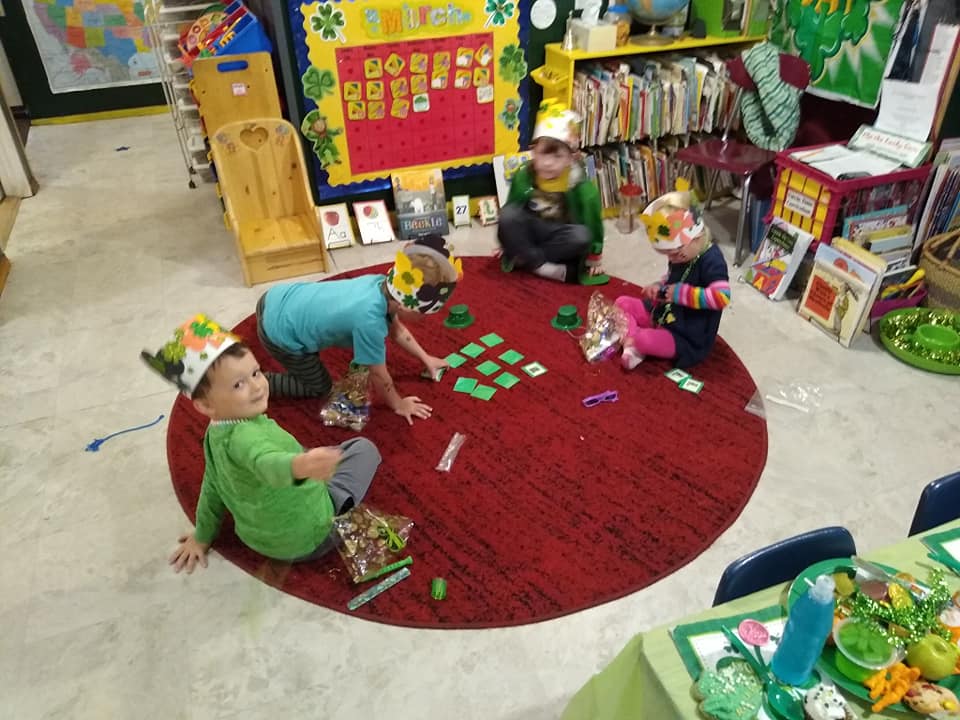 Happy St. Patrick’s Day!!! Top o’ the Morning! The wee little folk in the Teddy Bear class had our traditional Irish music playing all morning, and proudly wore our personally crafted shamrock headbands most of the day. But no, we did not catch a leprechaun this year—I know! We were so hoping. Those little rascals are just too quick. And they once again made a big mess in our playroom! They did leave us some rather delicious green rainbow candy treats, which made up for their shenanigans. We started our day by Decorating a Shamrock Cookie & Playing a Lucky Coin Toss Game, winning Shamrock Tattoos, and having fun with a Wild Shamrock Match Game & St. Patrick’s Day Bingo game, earning Treat Bags! Then we went outside and played Find the Shamrock, winning Shamrock Necklaces. We got to also watch Green Eggs and Ham and earn a cute mini–Leprechaun Hat. We listened to the story “Lizzie the Lazy Leprechaun” before feasting on green Jell-O, green apples, Lucky Charms cereal, oranges, cheese & crackers, green grapes (cut up), frosted shamrock cookies, scrumptious festive shamrock cupcakes, rainbow fruit roll-ups and green punch. And then we enjoyed a special St. Patrick’s Day movie.