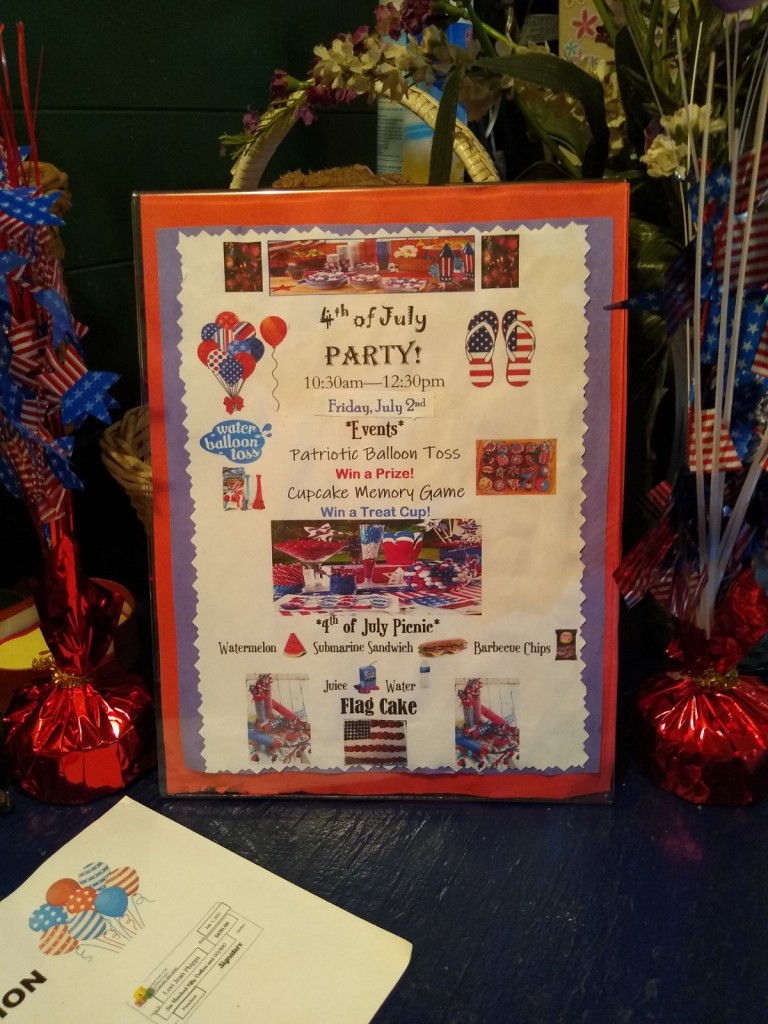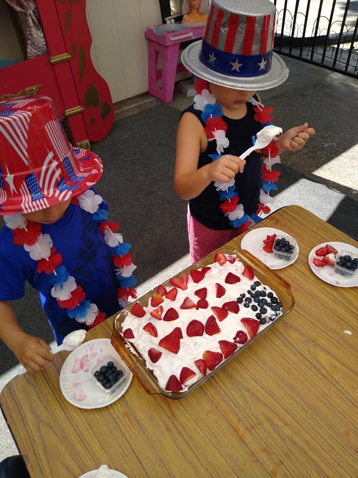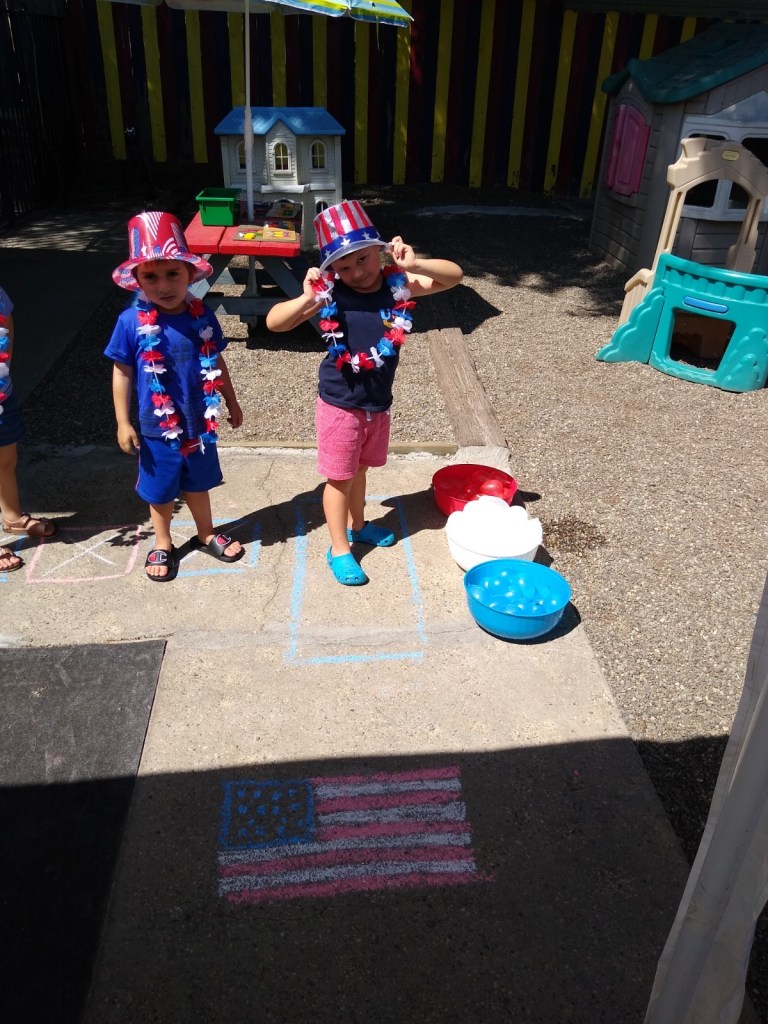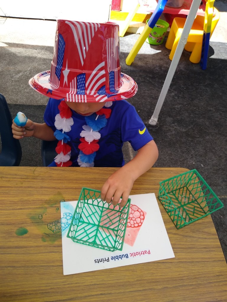 After we engaged in a rollicking Patriotic Cupcake Memory Game, a 4th of July Bingo Game, and colored our Independent Day Plaques, and made Patriotic Bubble Prints we engaged in a thrilling Balloon Toss Game (earning a treat cup, pinwheels, and mini hats!). Then we created a U. S. A. Flag Cake to enjoy at our Traditional Independence Day Picnic along with Submarine Sandwiches, Barbecue Chips, Watermelon, 4th of July Tutti Pops and Fruit Punch. We already crafted our spectacular 4th of July shakers, made nifty patriotic fans, popsicle stick flags and colored fireworks pictures this week. Have a fabulous 4th of July everyone! ![]()