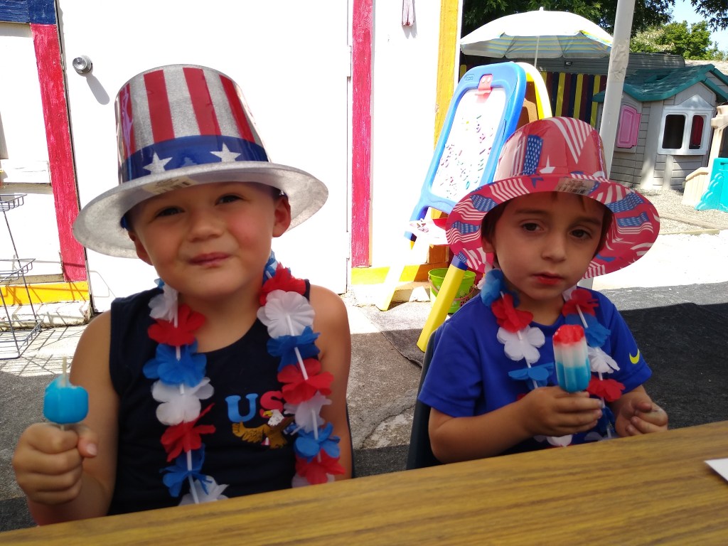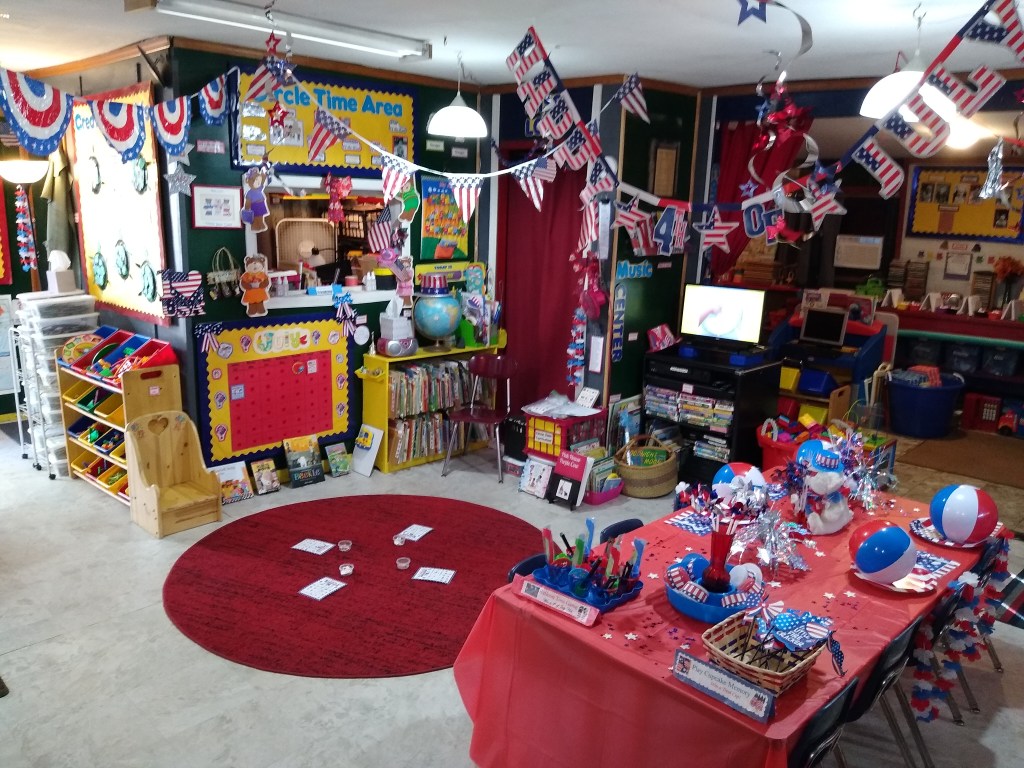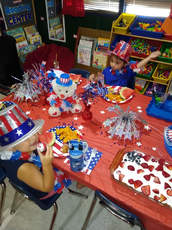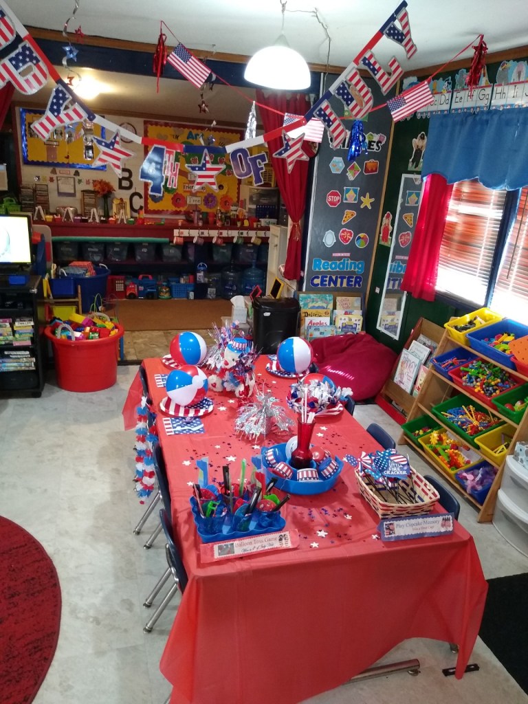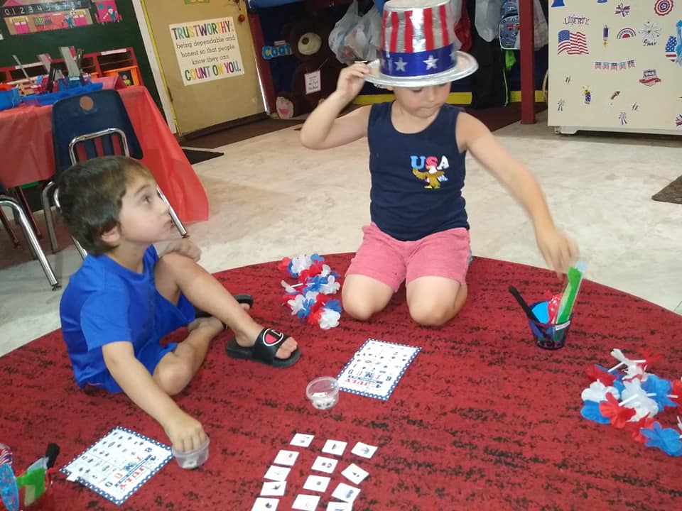 After we engaged in a rollicking Patriotic Cupcake Memory Game, a 4th of July Bingo Game, and colored our Independent Day Plaques, and made Patriotic Bubble Prints we engaged in a thrilling Balloon Toss Game (earning a treat cup, pinwheels, and mini hats!). Then we created a U. S. A. Flag Cake to enjoy at our Traditional Independence Day Picnic along with Submarine Sandwiches, Barbecue Chips, Watermelon, 4th of July Tutti Pops and Fruit Punch. We already crafted our spectacular 4th of July shakers, made nifty patriotic fans, popsicle stick flags and colored fireworks pictures this week. Have a fabulous 4th of July everyone! ![]()