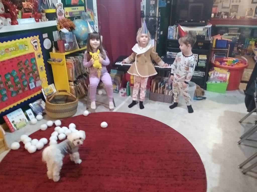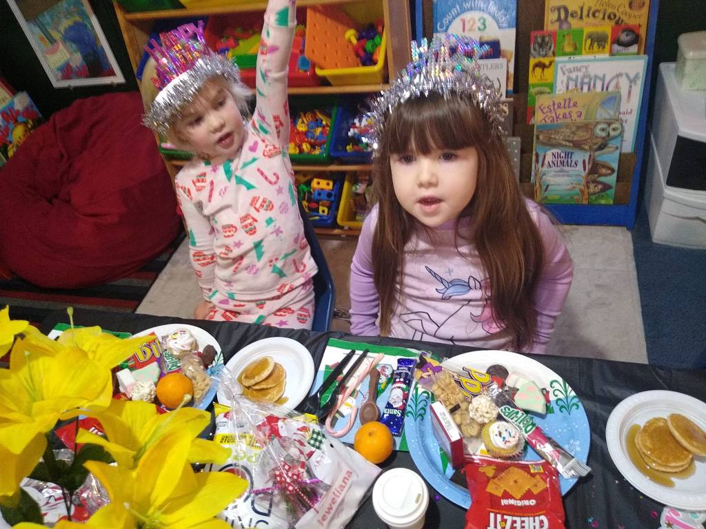 Our Pajama Day New Year’s Party was outrageous and so much fun! We had an indoor snowball throw competition, listened to Auld Lang Syne, talked about the countdown celebrations around the world on New Year’s Eve, and played a riveting Penguin Match Game for letter P and for winter, earning a treat bag of surprises! Then we heard the story The Night Before New Year’s Eve, and enjoyed feasting on pancakes with syrup! Then we sipped cocoa with marshmallows and munched on popcorn while watching The Polar Express.