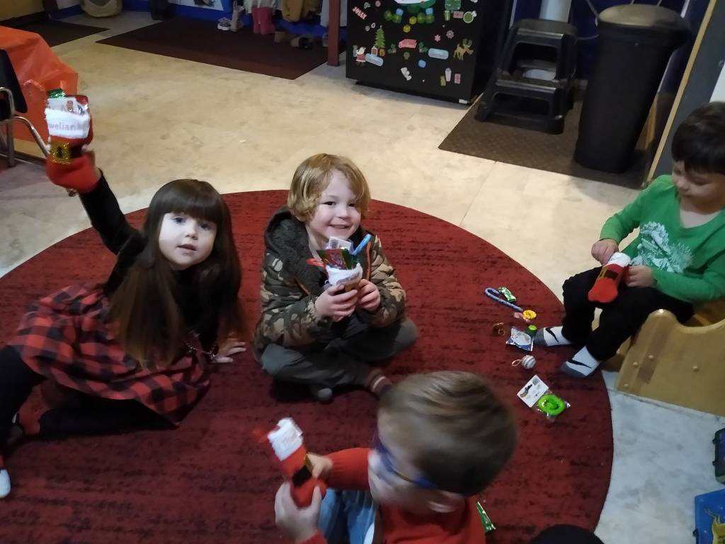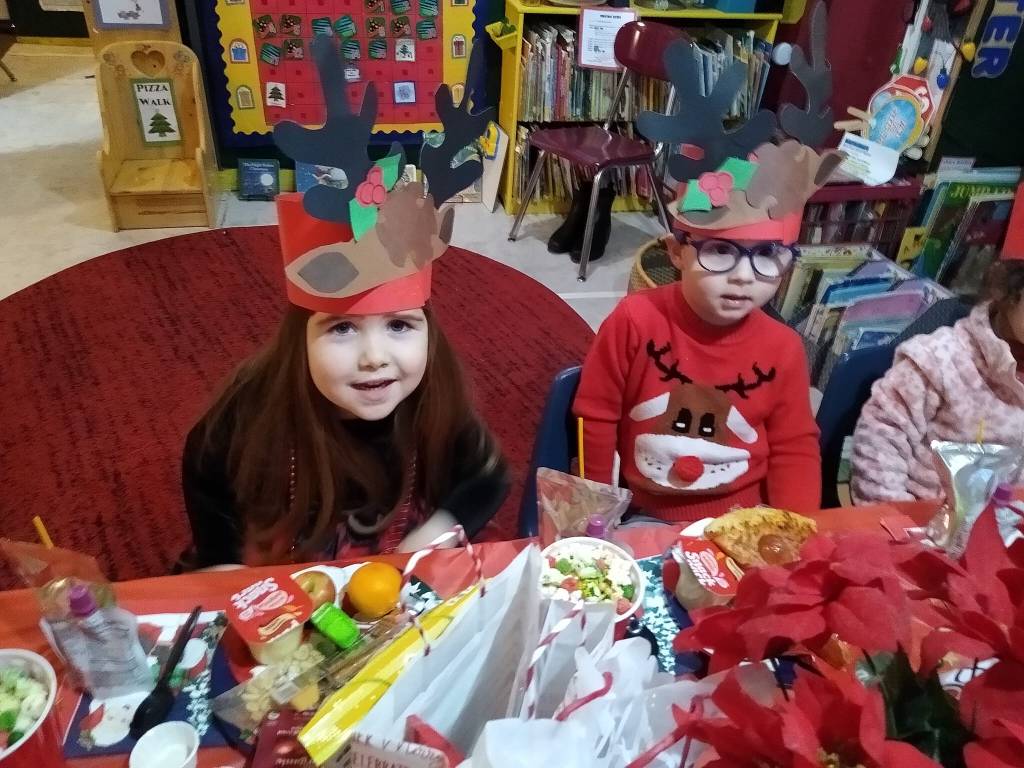 We had a magical celebration. First, we colored our Holiday CRAFT BAG, and then we heard the LITTLE CHRISTMAS ELF story and sang the Winnie the Pooh version of The Twelve Days of Christmas. We added our Santa hats to sing Raffi’s It Must Be Santa, which then motivated us to put on our bell adorned reindeer antlers and perform Jim Reeves Jingle Bells. And then we played games! We played THE PIZZA WALK (earning a Present & Chocolate Santa) while dancing to Run, Run Rudolph, and then we played THE HOLIDAY MEMORY GAME (earning a prize) and then THE BEAN BAG TOSS HOPSCOTCH (earning a treat bag). Then we had fun getting involved in a CHRISTMAS COOKIE DECORATING contest (winning treat cups). Then it was time for our HI PIZZA MAN story to prepare us for our surprise delivery person! This year it was a REINDEER! And then on to our huge feast.