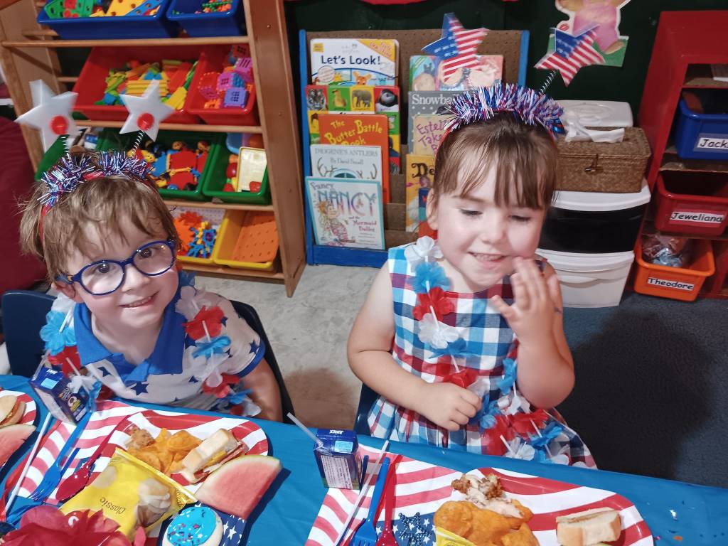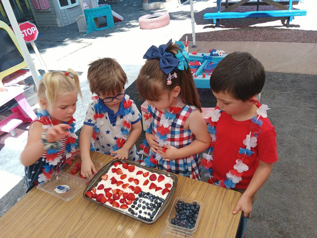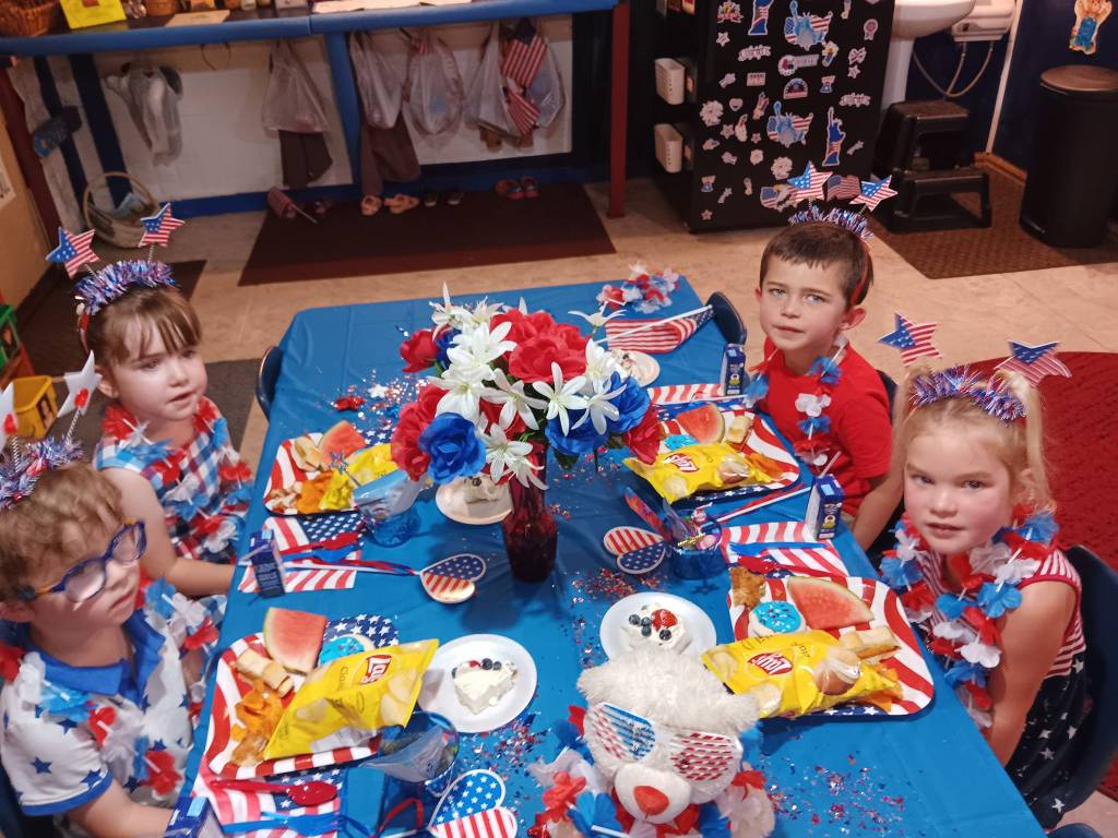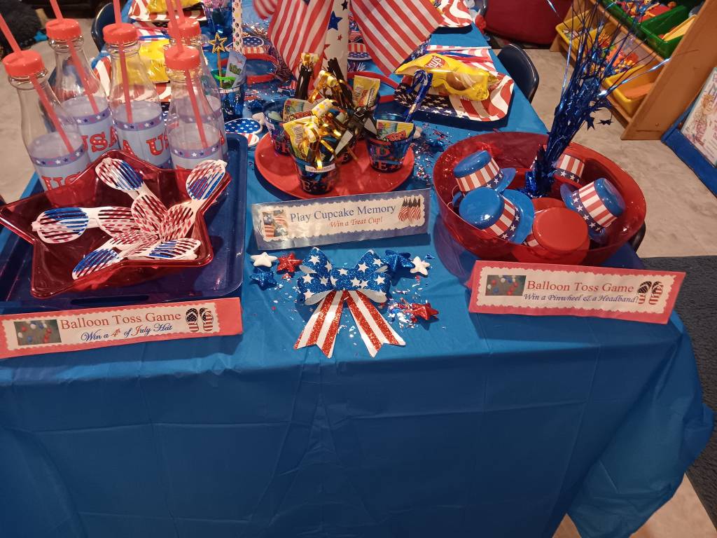 After we engaged in a rollicking Patriotic Cupcake Memory Game, a 4th of July Bingo Game, and painted our Independent Day Plaques, we engaged in a thrilling Balloon Toss Game (earning a 4th of July treat cup, flags, patriotic bottles, sunglasses, and mini hats!). Then we created a U. S. A. Flag Cake to enjoy at our Traditional Independence Day Picnic along with Submarine Sandwiches, Barbecue Chips, Watermelon, patriotic cookies, 4th of July bomb pops, and mango nectar punch. We already crafted our spectacular 4th of July shakers, made nifty patriotic fans, popsicle stick flags and colored fireworks pictures this week.