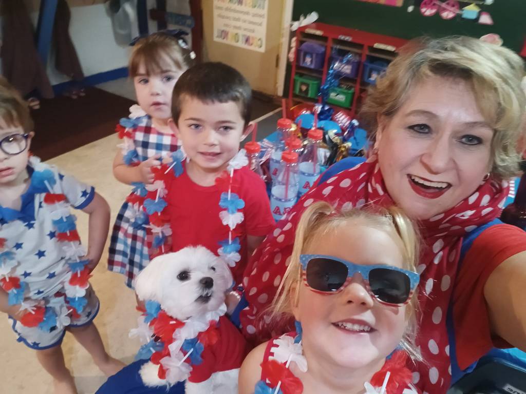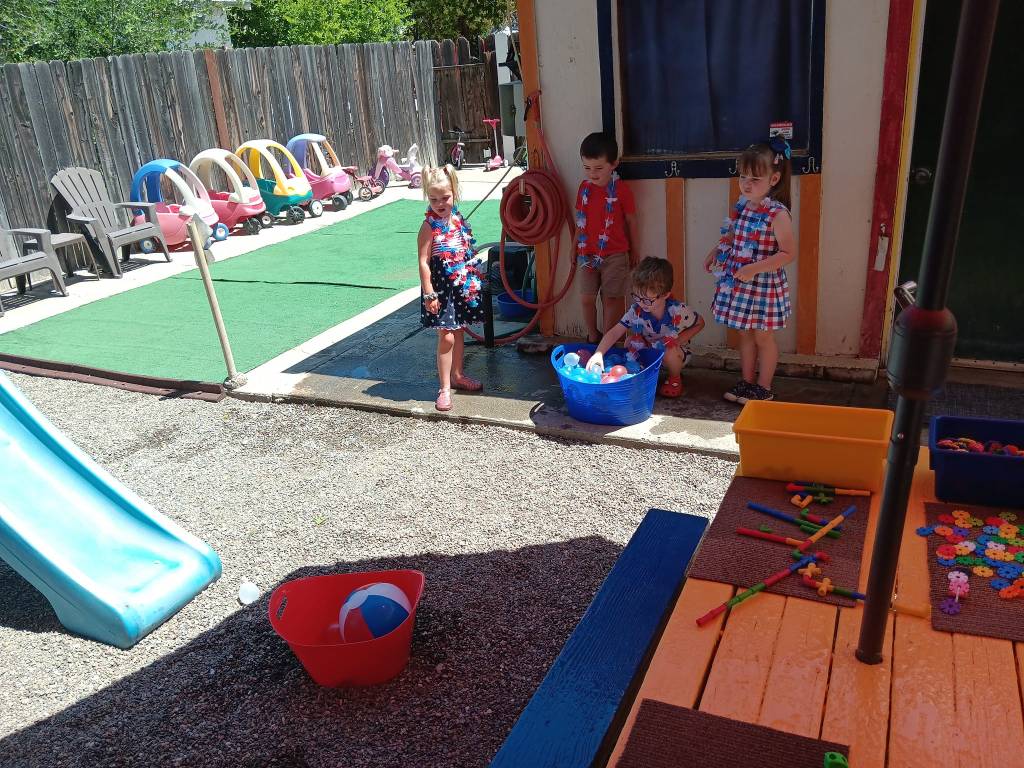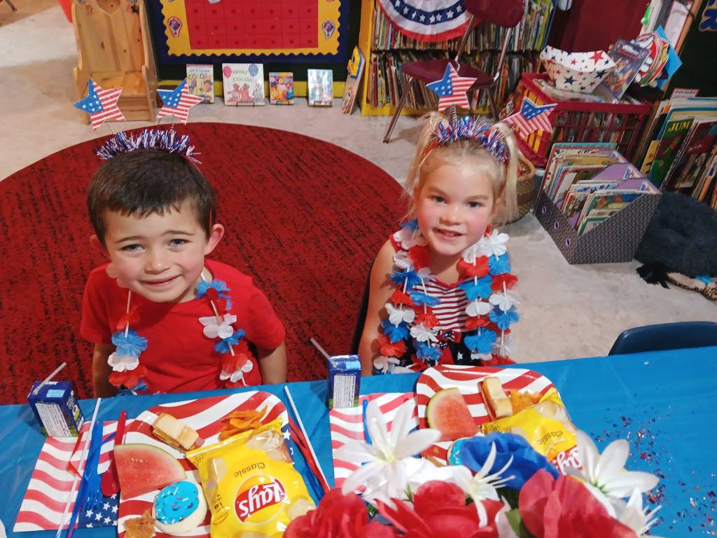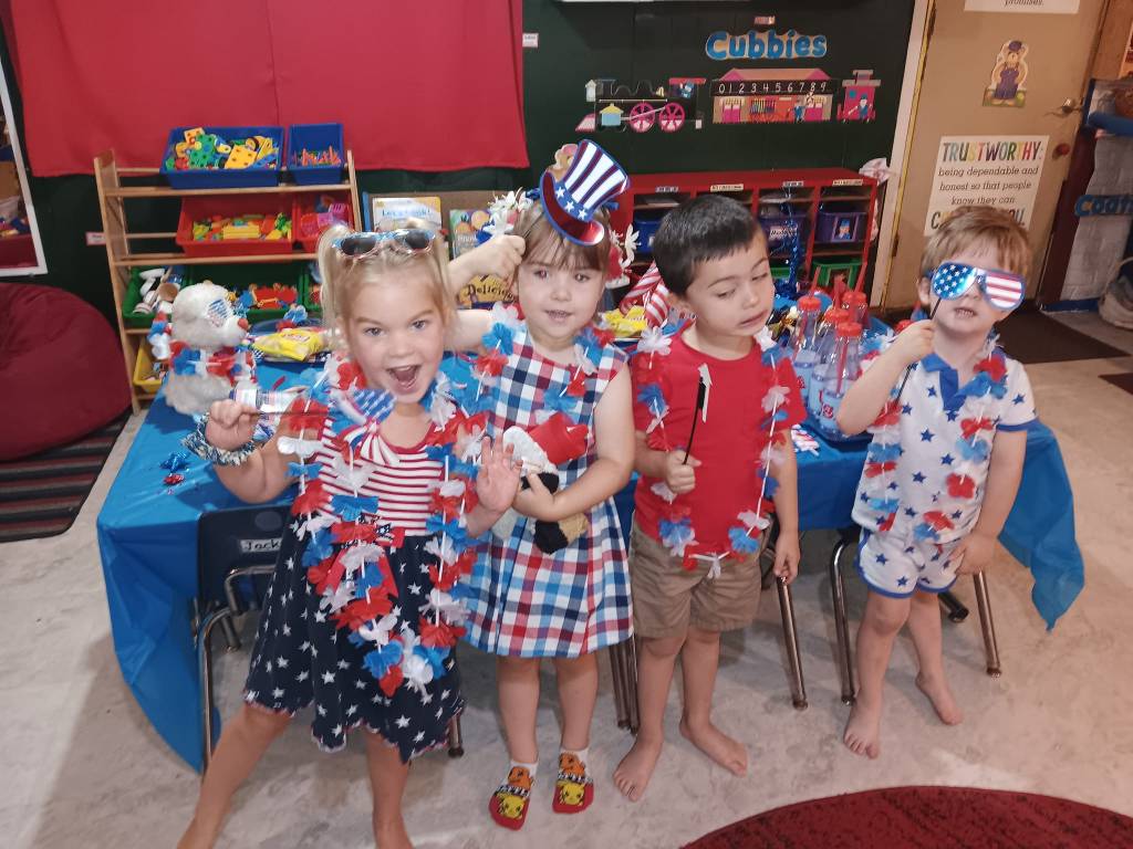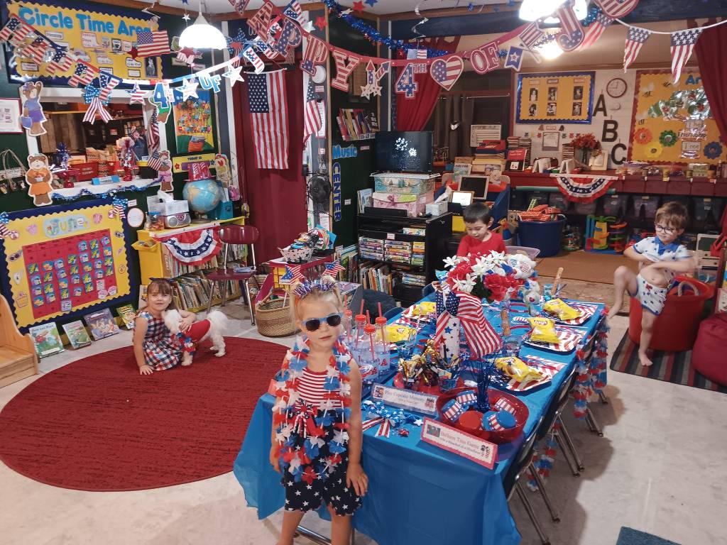 After we engaged in a rollicking Patriotic Cupcake Memory Game, a 4th of July Bingo Game, and painted our Independent Day Plaques, we engaged in a thrilling Balloon Toss Game (earning a 4th of July treat cup, flags, patriotic bottles, sunglasses, and mini hats!). Then we created a U. S. A. Flag Cake to enjoy at our Traditional Independence Day Picnic along with Submarine Sandwiches, Barbecue Chips, Watermelon, patriotic cookies, 4th of July bomb pops, and mango nectar punch. We already crafted our spectacular 4th of July shakers, made nifty patriotic fans, popsicle stick flags and colored fireworks pictures this week.