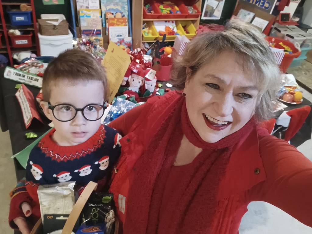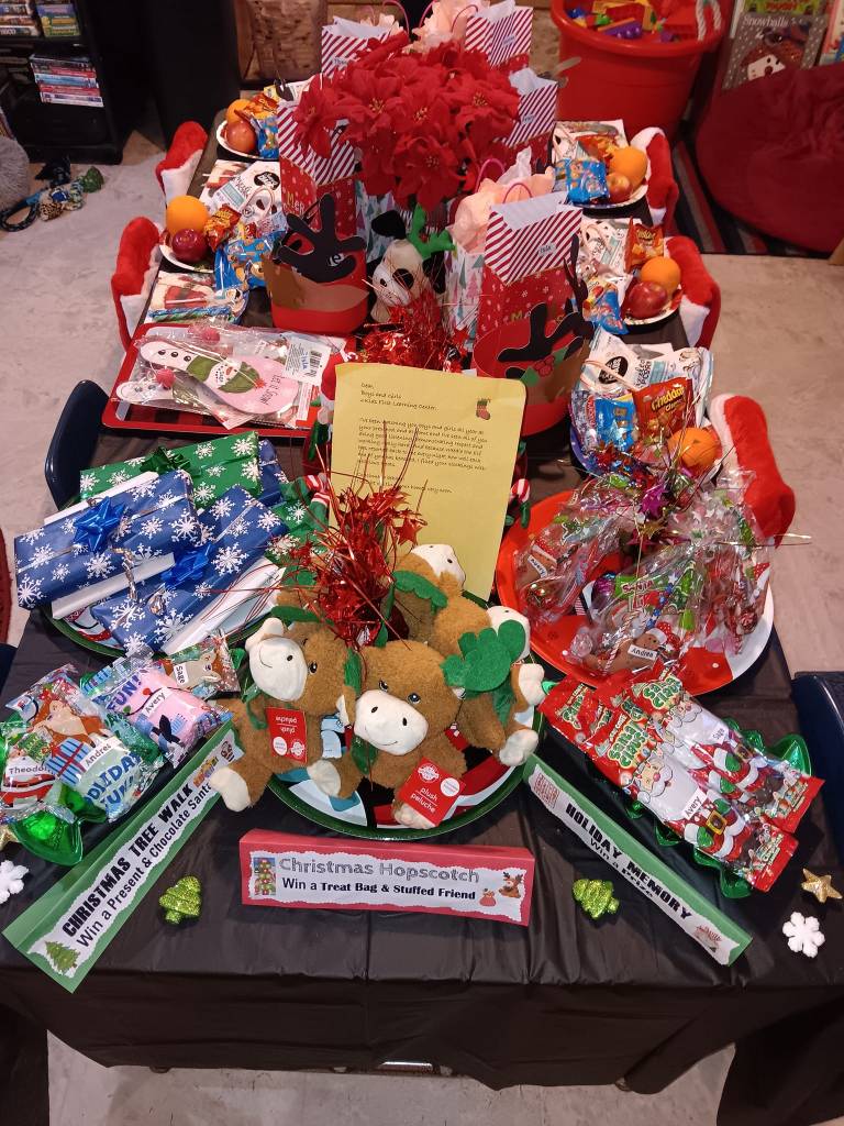 Feliz Navidad! We had a magical celebration. First, we colored our Holiday CRAFT BAG, and then we heard the Winnie the Pooh version of The Twelve Days of Christmas. And then with our Santa hats on we sang and danced to a variety of Christmas songs. And then we played games! We played THE CHRISTMAS TREE WALK (earning a Present & Chocolate Santa), and then THE HOLIDAY MEMORY GAME (earning a prize) and then THE BEAN BAG TOSS HOPSCOTCH (earning a treat bag). Then we had fun getting involved in a CHRISTMAS COOKIE DECORATING contest (winning a treat bag). Then it was time for our HI PIZZA MAN story to prepare us for our surprise delivery person from Celestino’s! This year it was a PIZZA WOMAN wearing a Santa Hat! And then on to our huge feast.