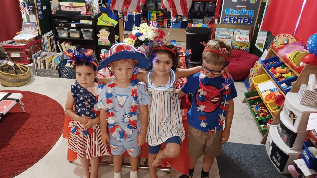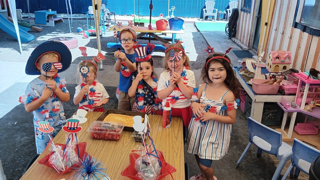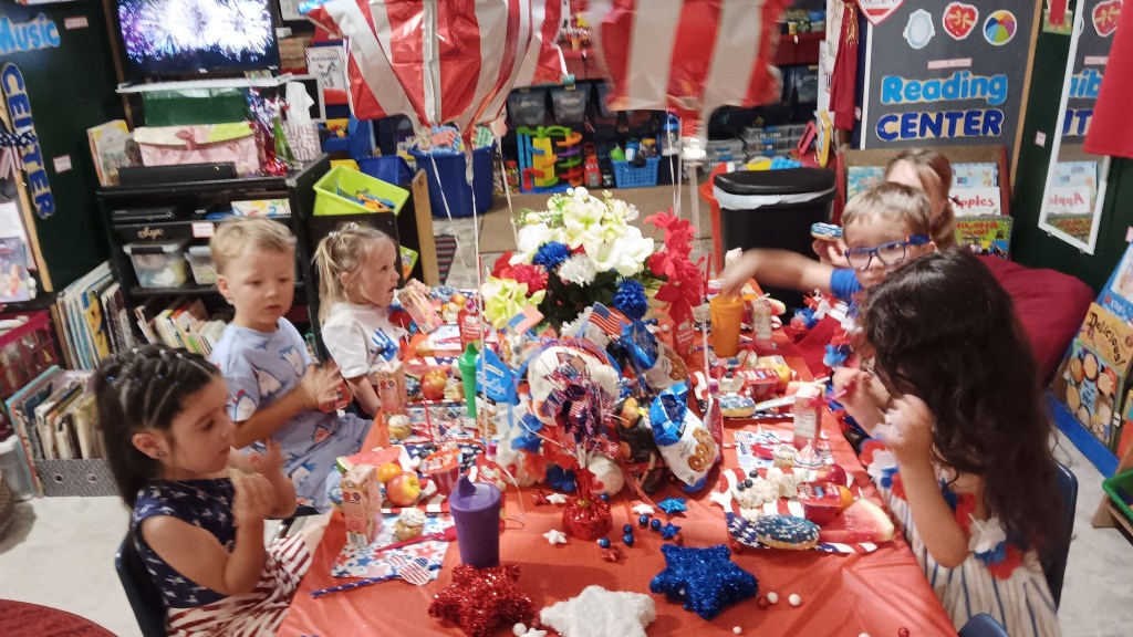 We engaged in a rollicking Patriotic Cupcake Memory Game, a 4th of July Bingo Game, painted our Independence Day Sun Catchers, and engaged in a thrilling Balloon Toss Game (earning 4th of July treat cups and toys). Then we enjoyed decorating and devouring our U. S. A. Flag Cake along with Submarine Sandwiches, Barbecue Chips, Watermelon, patriotic donuts, cupcakes, and 4th of July bomb pops! We already crafted our spectacular 4th of July shakers, made nifty patriotic fans, popsicle stick flags, and colored fireworks pictures in celebration of this holiday. It has been an awesome day!!!