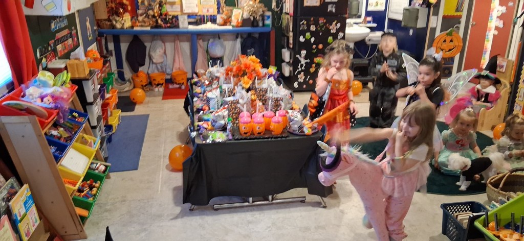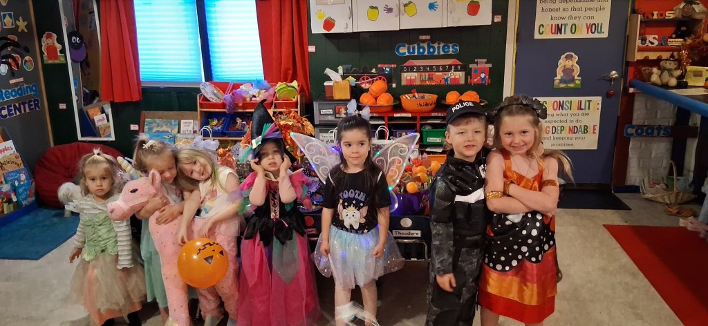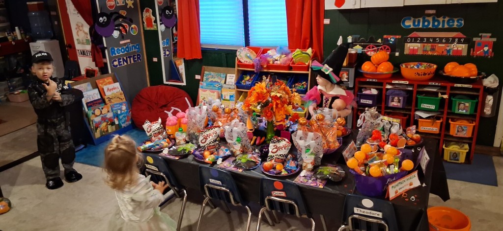 We had a spectacular HALLOWEEN BASH in the KIDS FIRST Teddy Bear Class! We had the best time earning prizes after doing a Halloween Craft, listening to the hilarious Skeleton Hiccups book, dancing to the Monster Mash at our Pumpkin Walk contest, playing a Witch Hat Ring Toss Game, and spinning around in circles to pin the Witch Hat on the Big Orange Pumpkin. The Purple People Eater, Witch Doctor, and Walking Through the Cemetery songs brought us into the Halloween spirit while we feasted on our Halloween-appropriate snacks! And then winding down the activities with a Halloween Cartoon made it a huge success. Have a great time TRICK OR TREATING Everyone!