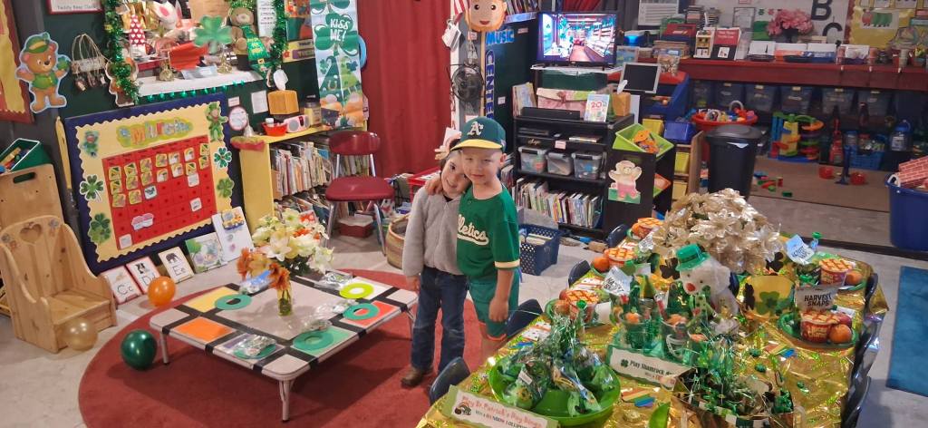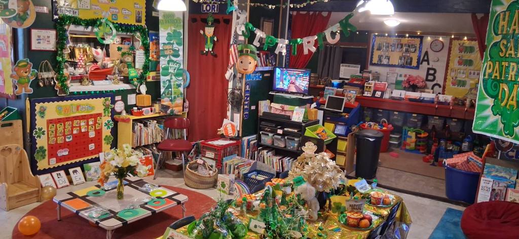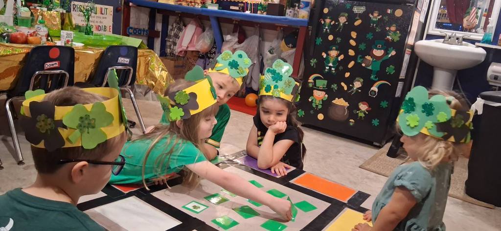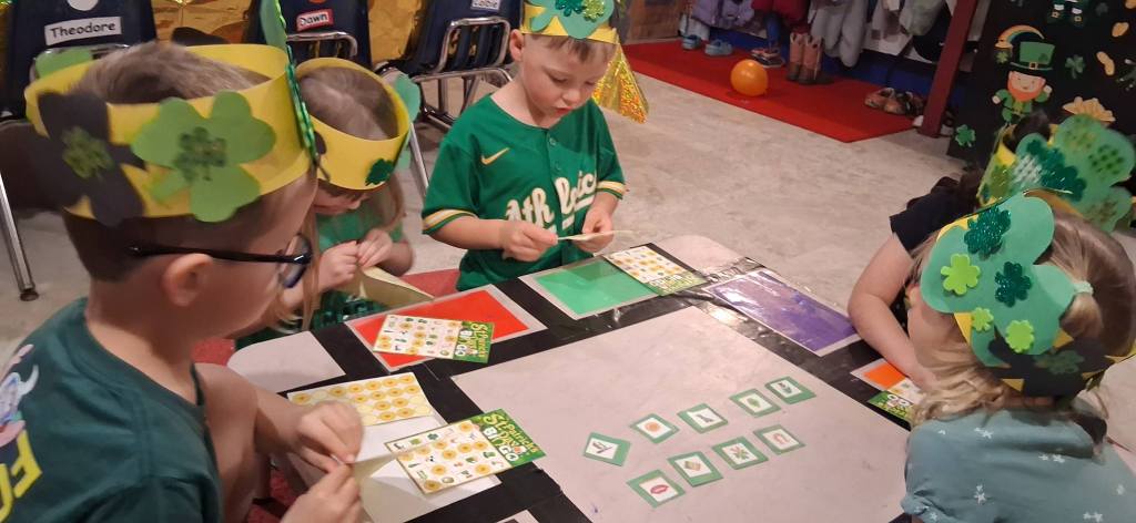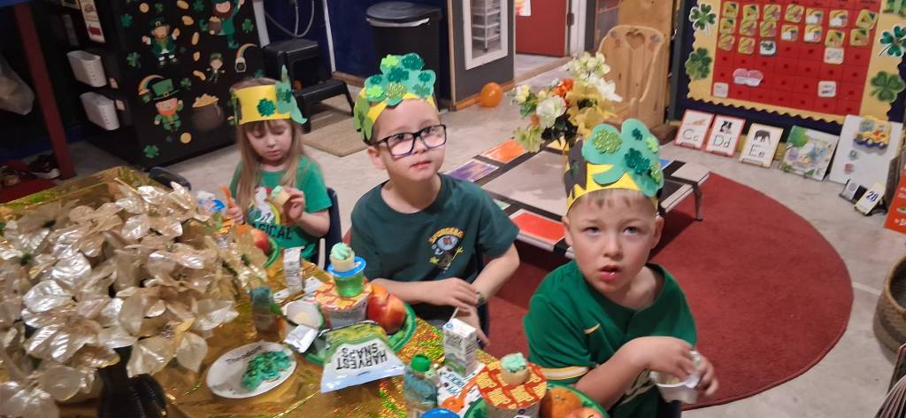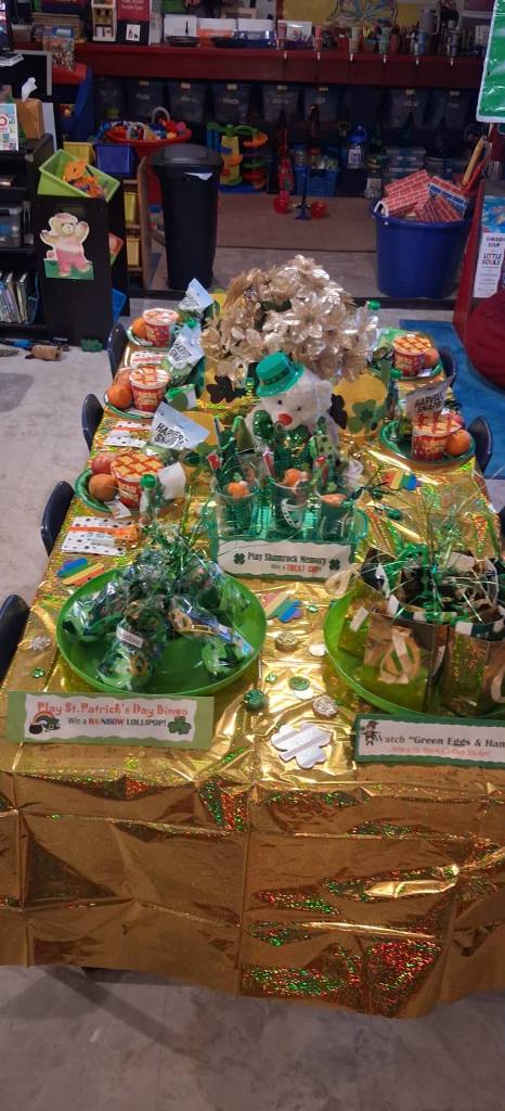 We also watched Green Eggs and Ham and feasted on green Jell-O, green harvest snaps, apples, oranges, Lucky Charms cereal, festive shamrock cupcakes, rainbow fruit roll-ups, and green apple juice. And then we enjoyed a special St. Patrick’s Day movie.